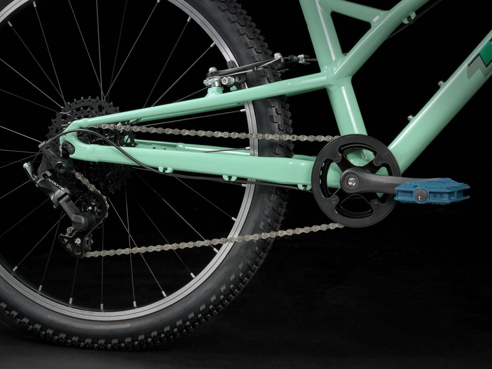 Einen Rahmen aus Alpha Silver Aluminium mit 24 Zoll großen Laufrädern und 2 Zoll breiten Reifen, die für Grip und Geschwindigkeit auf Asphalt konzipiert sind. Dazu gibt es eine speziell auf Kinderbedürfnisse zugeschnittene Ausstattung, wie etwa die intuitive 8-Gang-Schaltung von microSHIFT und unkomplizierte Felgenbremsen samt kindgerechten Bremshebeln.